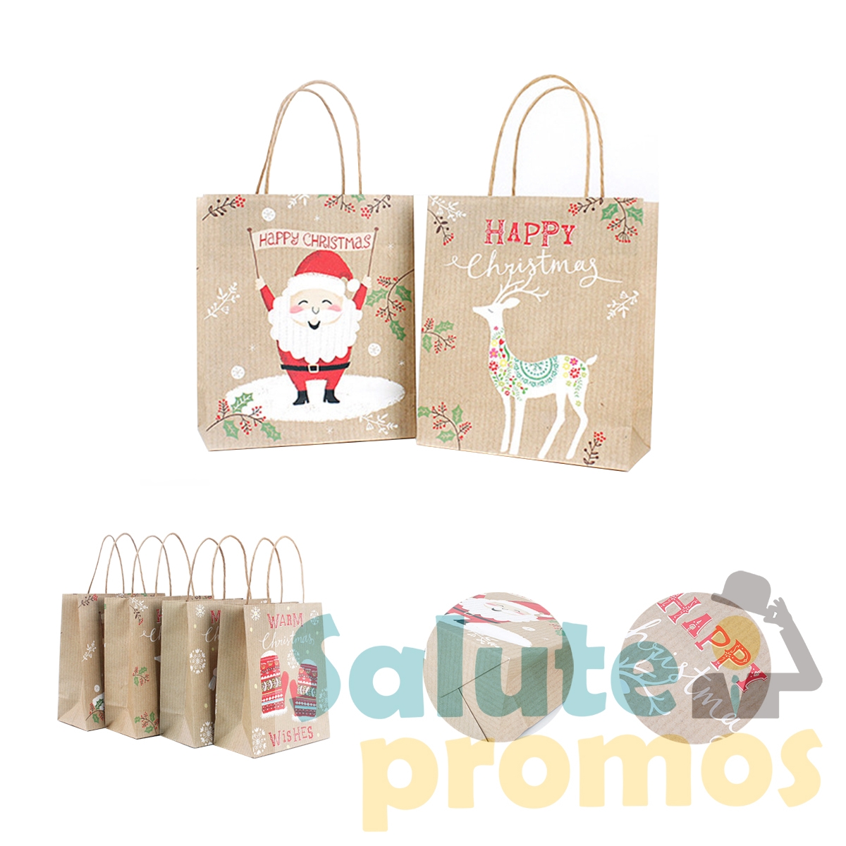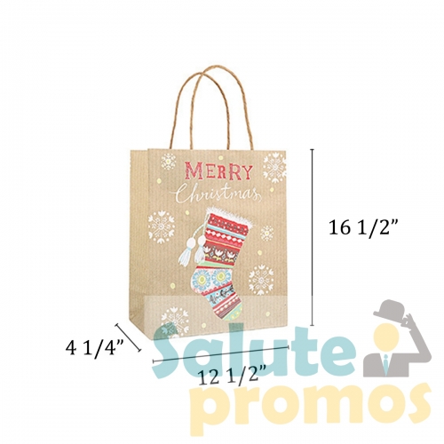 These Christmas-friendly kraft paper bags are made of 120GSM kraft paper, which is environmentally friendly and safe make it can be reused for many times. Features matching twisted kraft paper handles and Christmas theme imprint. A group of four bags with different patterns to enhance Christmas atmosphere. It is ideal for wrapping Christmas gifts, collect toys, dolls, Christmas hats, candy and gifts to create a Christmas atmosphere.