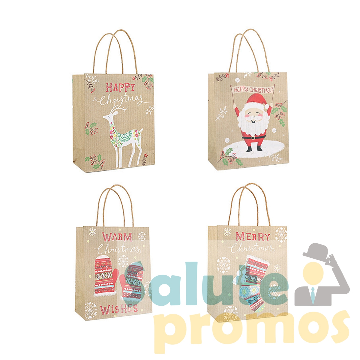 These Christmas-friendly kraft paper bags are made of 120GSM kraft paper, which is environmentally friendly and safe make it can be reused for many times. Features matching twisted kraft paper handles and Christmas theme imprint. A group of four bags with different patterns to enhance Christmas atmosphere. It is ideal for wrapping Christmas gifts, collect toys, dolls, Christmas hats, candy and gifts to create a Christmas atmosphere.