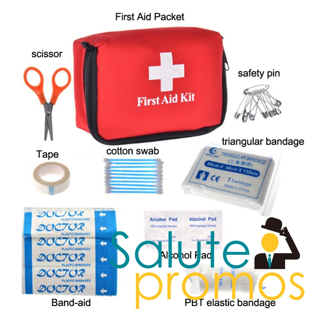 This mini first aid kits is made of 600D polyester provides 10 first aid materials you need for a functioning safety giveaway. Contains 1 PBT bandage, 1 sissor, 6 adhesive bandage, 1 first aid tape, 2 alcohol prep pad, 1 tweezer, 1 mask, 2 iodophor cotton swab, 10 cotton swab. It is a great giveaway for safety programs, camping, travel or other outdoor activities.